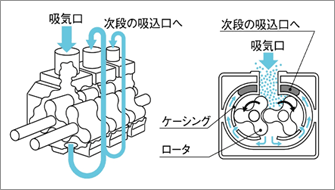 | 多段ルーツ型ドライ真空ポンプは、ケーシングと呼ばれる箱の中に三つ葉のロータ(回転体)が2つ入っており、一対のギアによって互いに反対方向に同じ周期で回転しています。ロータ同士、またロータとケーシングは接触することがなく、わずかな隙間を保ちながら回転して気体を移送圧縮します。ロータを多段構造にし、大気圧まで圧縮し、大気中に排気します。ロータ・ケーシング内には油等の封液は使用しておらずクリーンな排気が可能です。ギヤやベアリングには潤滑のために油を使用しておりますが、シール構造を工夫し油がケーシング内に入らないようになっています。 | ![]() |